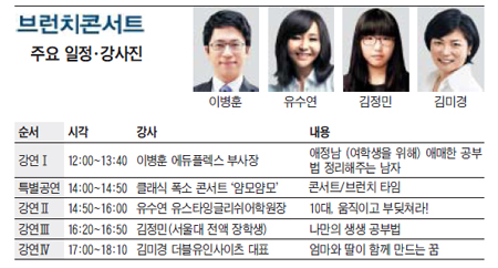 롤모델, 공부법 등을 주제로 중고생 대상 강연에 신선한 바람을 일으키고 있는 조선에듀케이션 주최 브런치콘서트가 ‘모녀가 함께 배우고 즐기는 10월의 브런치콘서트’란 주제로 10월 20일(토) 찾아갑니다. 가을이 무르익는 주말, 엄마와 딸이 소통, 공감하며 알차고 신나는 하루를 보내는 일정입니다. 강연 도중엔 재밌는 클래식 공연이 곁들여져 즐거움을 선사합니다. △이병훈 에듀플렉스 부사장이 짚어주는 ‘여학생을 위한 공부법’ △클래식 폭소 콘서트 ‘얌모얌모’ 특별 공연 △국내 최고의 토익 강사 유수연 유스타잉글리쉬어학원장의 ‘10대를 향해 던지는 메시지’ △‘스피치 명강사’ 김미경 더블유인사이츠 대표가 들려주는 ‘성공적 모녀 관계’ 등 브런치콘서트만의 차별화된 콘텐츠를 감상하며 깊어가는 가을, 모녀만의 소중한 추억을 만들어보세요.
