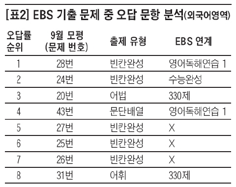 올해 9월 모평 독해 부분에서 수험생이 가장 많이 틀린 문제는 [표2]와 같다.