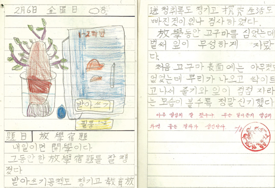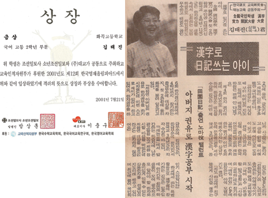 한자공부를 한 뒤 따로 복습을 하지 않아도 일기를 쓰면서 자연스럽게 최고의 복습을 할 수 있었다. 그때 그린 그림일기는 지금까지 고스란히 보관되어 있다. 또박또박 쓴 필체는 초등학생이 쓴 것이라고는 믿기 어려울 정도로 깔끔했다. 매일매일 차분하고 진중하게, 글자 하나하나를 음미하며 써내려갔을 그의 모습이 상상되었다. 꾸준하고 성실하게 일기를 쓴 사실이 알려져서 ‘한자 일기를 쓰는 아이’라고 소개되기도 했다.