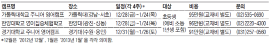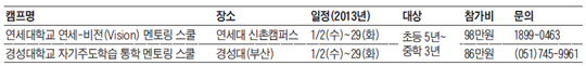 연세대학교와 경성대학교(부산 소재)는 통학형으로 자기주도학습 멘토링 캠프를 개최합니다. 학원과 캠프를 병행하고 싶은 초·중학생에게 알맞은 프로그램입니다. 명문대 멘토들과 공부하며 자신의 롤모델을 찾고 그들의 학습 비법을 배우게 될 이번 행사에 학부모 여러분의 많은 관심 바랍니다.