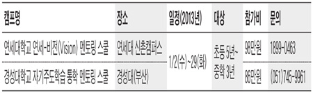 연세대학교(신촌캠퍼스)와 경성대학교(부산)는 통학형 자기주도학습 멘토링 캠프를 개최합니다. 학원과 캠프를 병행하고 싶은 초·중학생에게 알맞은 프로그램입니다. 명문대 재학생 멘토들과 공부하며 자신의 롤모델을 찾고 그들의 학습 비법을 배우게 될 이번 행사에 학부모 여러분의 많은 관심 바랍니다.