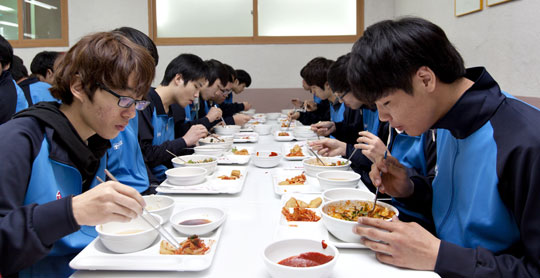 한샘아카데미의 일과는 오전 6시 30분부터 시작된다. 그 시각, 식당은 이미 학생으로 북적였다. 좌석은 성별로 분리돼 있다. 식사 후 강의실로 돌아온 재원생은 서둘러 수학·영어 1일 평가를 치렀다. 지난해 대학수학능력시험 외국어 영역에서 3등급을 받은 양태영(경기 남양주 진건고 3년)군은 영어 받아쓰기에 열심이다. 염동화(경기 부천 시온고 졸)군은 기분 좋게 수학 쪽지 시험에서 만점을 받았다.