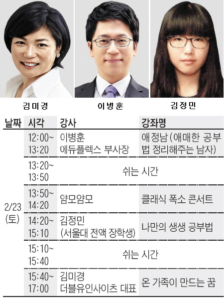 조선에듀케이션이 주최하는 신개념 토크 공연 브런치콘서트가 이번 주 토요일(23일) ‘가족 공감’ 콘셉트로 부산 지역 중고생과 학부모를 찾아갑니다. △대한민국 최고 명강사 김미경이 전하는 가족 공감 메시지 △중고생을 위한 ‘맞춤형 공부법’ △클래식 폭소 콘서트 ‘얌모얌모’ 특별 공연 등 알찬 프로그램이 마련됩니다. 곧 시작되는 2013학년도, 대한민국 최고 명사들과 함께 준비하세요.