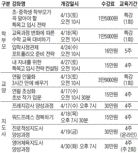 조선에듀케이션이 직영하는 조선교육문화센터는 자기 계발과 자녀 교육에 관심 있는 학부모를 대상으로 다양한 프로그램을 운영 중입니다. 이달에도 △취업·창업이 가능한 지도사 과정 △자기주도적 학부모를 양성하는 학부모 교육 △삶의 여유를 찾을 수 있는 취미 교육 등이 마련됩니다. 독자 여러분의 많은 관심 바랍니다.