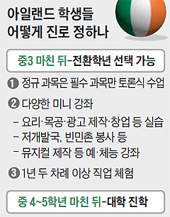 아일랜드 학제는 '유치원 2년→초등학교 6년→중학교 5년'이다. 중3 마치고 한국 연합고사에 해당하는 '중등학력인증시험'(Junior Certificate)을 본다. 곧바로 중4년이 되는 대신 1년 동안 다양한 실습과 직업체험을 통해 학생 스스로 앞길을 정하는 것이 전환학년 제도다. 5년이면 졸업할 중학교를 6년 걸려 마치는 대신, 서른 다 돼서 "내가 뭘 하고 싶은지 나도 잘 모르겠다"고 헤매는 상황을 줄일 수 있다.
