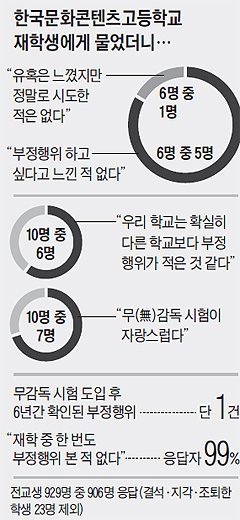 교사들이 반마다 시험지를 나눠주고, 학생들이 문제 푸는 모습을 3~5분간 지켜보다 조용히 교실을 떠났다. 층마다 2명씩 남았지만, 부정행위를 감시하기 위해서는 아니었다. 강종례(53) 교무부장은 "갑자기 배앓이를 하거나 답안지를 새로 달라는 학생이 간혹 있어 복도 한쪽에 대기한다"고 했다. 복도에 남아봤자 창문이 높아(창틀 기준 165㎝) 교실 안을 엿보긴 쉽지 않았다.