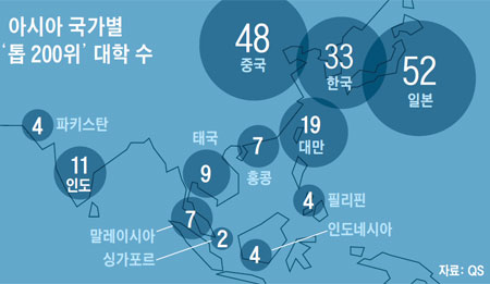 또 글로벌 산업 현장에서는 우리 대학 졸업생들이 좋은 평가를 받고 있는 것으로 조사됐다. 아시아 대학평가 항목 중 '졸업생 평판도'에서 한국 대학들의 성적이 급상승하고 있는 것이다. 국내외 기업에 취업한 학생들에 대해 글로벌 기업 인사 담당자들은 '한국 대학 출신들이 일을 잘한다'고 꼽았다. 경희대·이화여대 등 주요 대학들의 '졸업생 평판도'가 높게 나타났다.