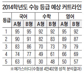 영어 영역 1등급 예상 커트라인은 A형이 95점, B형 92점으로 작년 93점과 비슷한 수준이었다. 그러나 영어 B형에는 문·이과 상관없이 상위권 학생이 몰렸기 때문에 수험생 체감 난도(難度)는 굉장히 높았다고 전문가들은 분석했다. 특히 이과생이 주로 치는 수학 B형은 9월 모의고사보다 1등급 컷이 5점이나 떨어져, 수험생들이 매우 어렵게 느꼈을 것이라는 얘기가 나온다.