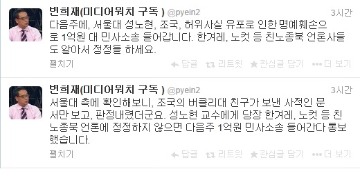 조 교수는 이날 아침 자신의 트위터에 “버클리 로스쿨과 서울대의 공식판정 후에도 ‘조국 박사논문 표절’ 운운하는 글과 말을 돌리는 행위는 민사ㆍ형사상 책임을 진다. 그 이전까지 주장가능했던 공인에 대한 검증 항변은 이제 끝!”이라고 적어 올렸다. 더 이상의 의혹 제기에 대해선 법적으로 대응하겠다는 의미다.