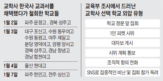 교학사 교과서를 채택한 학교 명단은 지난달 31일 민주당 국회의원을 통해 알려졌다. 이후 해당 학교들은 항의 및 협박 전화와 시위에 시달리면서 줄줄이 교학사 교과서 채택을 포기했다.