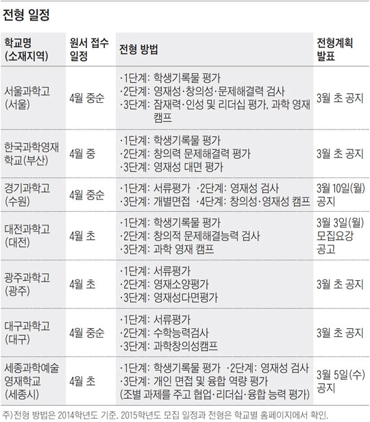 1차 전형에선 자기소개서·영재성 입증자료·추천서·학교생활기록부 등의 서류가 필요하다. 서울과학고 입학을 앞둔 김민준(서울 경원중 졸)군은 지난해 이맘때쯤 1차 전형 준비에 박차를 가했다. 각종 수상 내역이 많았던 김군은 자기소개서에 기재할 경력 사항을 정리하는 데 시간을 투자했다. 입학담당관에게 '과학만 아는 외곬'의 이미지를 남기고 싶지 않았던 김군은 봉사활동과 회장 선거 도전 경험 등을 자세히 썼다. 대회 수상 경력에 대해 언급할 때도 얼마나 열심히 공부했는지에만 초점을 맞춰 서술했다.