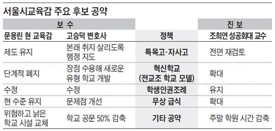 반면 조희연 후보가 당선되면 정반대 상황이 될 전망이다. 조 후보는 "자사고가 폐지돼야 일반고가 살아날 수 있다"고 강조한다. 자사고 정책을 재검토하고, 대신 혁신학교를 확대하겠다는 공약이다.