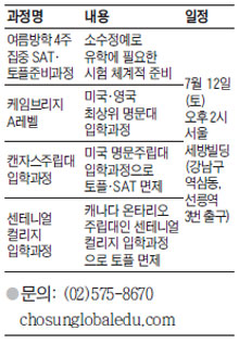 ◇토플·SAT 성적 없이도 OK토플 성적이 없거나 SAT 준비가 부담스러운 학생이 공인어학성적을 대체하는 해당 대학 과정을 통해 입학할 수도 있다. 미국이나 캐나다 본교에서 운영하는 어학 과정을 국내에서 이수한 다음 진학하는 것. 캔자스주립대 EAP(English for Academic Purposes)과정이 대표적이다. 4300여개 미국 대학 가운데 상위 3%에 해당하는 캔자스주립대는 국내에 EAP과정을 개설, 최소 4개월간 어학 과정을 이수하면 토플과 SAT 없이도 입학 가능하다.