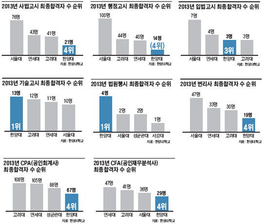 10개 그룹 91개 상장사 대표이사 125명 가운데 삼성테크윈 김철교(통신공학), 현대제철 박승하(금속공학), 현대위아 윤준모(재료공학), LG이노텍 이웅범(화학공학), 롯데손해보험 김현수(회계학), GS리테일 허승조(공업경영학), 한화 박재홍(기계공학) 대표 등이 모두 한양대 동문이다.