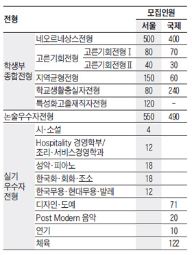 학생부종합전형은 전년도 1529명에서 2015학년도에는 2062명을 선발해 전년 대비 35% 확대했다. 전체 모집인원의 37.5%를 선발한다. 학생부종합전형에서는 기존 입학사정관전형인 네오르네상스전형을 확대해 선발하며, '지역균형전형'을 신설했다. 기존 사회공헌·역경극복자전형은 '고른기회전형'으로 명칭을 바꿔 선발하며, 학교생활충실자전형은 그대로 유지한다. 학생부종합전형(의학계열포함)의 모든 전형에서는 대학수학능력시험(이하 '수능') 최저학력기준을 반영하지 않는다.