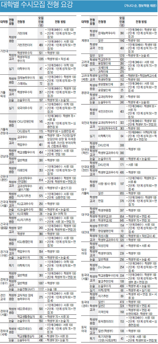 주요대학의 경우 올해 우선선발이 폐지됨에 따라 비교적 수능 성적이 낮은 학생들도 기회를 얻을 것으로 판단된다. 한양대는 특히 논술전형을 포함해 모든 수시전형에서 최저등급기준을 적용하지 않아 변화의 폭이 크다. 그 외 상위권 대학 논술전형에서는 학생부 반영비율이 30~40%로 대부분 교과 20%, 비교과 10~20%를 반영하는 경우가 많다.