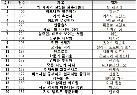 김난도 교수의 '아프니까 청춘이다'가 400건으로 뒤를 이었고, 3위는 '이기적 유전자'(리처드 도킨스·380건), 4위는 '정의란 무엇인가'(마이클 센들·302건), 5위는 '연금술사'(파을로 코엘료·279건) 순이었다.