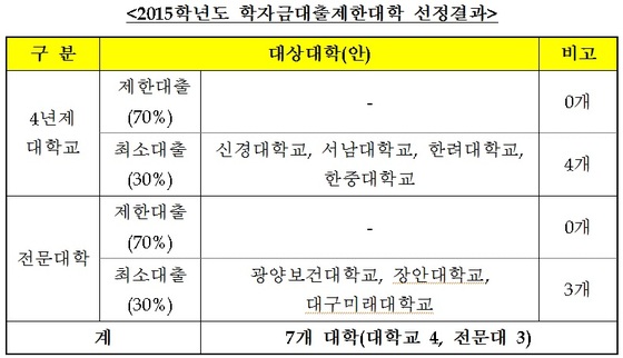교육부는 "2015학년도 입시를 준비하는 학생과 학부모들은 진학하고자 하는 대학이 학자금대출제한 또는 국가장학금을 지급하지 않는 대학인지 여부를 확인해 등록금 마련에 차질이 없도록 주의를 기울여달라"고 당부했다.