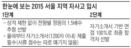 자기소개서 작성과 이를 기반으로 한 면접은 서울 지역 자사고 입시에서 올해부터 새롭게 추가된 전형 요소다. 자기소개서와 면접의 평가 영역은 크게 △자기주도학습영역(꿈과 끼 영역) △인성영역으로 나뉜다. 평가는 세부적으로 이뤄지지만 자기소개서는 영역 구분없이 각 항목을 모두 포함해 1200자 이내로 작성해야 한다. 서류 점수는 따로 매기지 않고 면접을 위한 자료로만 활용한다.