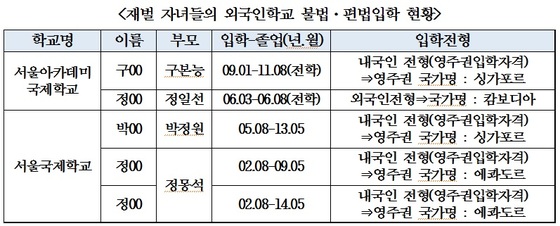 정 의원은 이들이 외국 영주권을 불법 취득하는 방식으로 불법·편법 입학했다고 설명했다. 정 의원에 따르면, 재벌가 자녀들은 상대적으로 영주권이나 국적을 취득하기 쉬운 싱가포르나 에콰도르, 캄보디아를 선택했다. 이 국가들은 현지에 일정 부분 투자만 하면 영주권이나 국적을 취득할 수 있다.