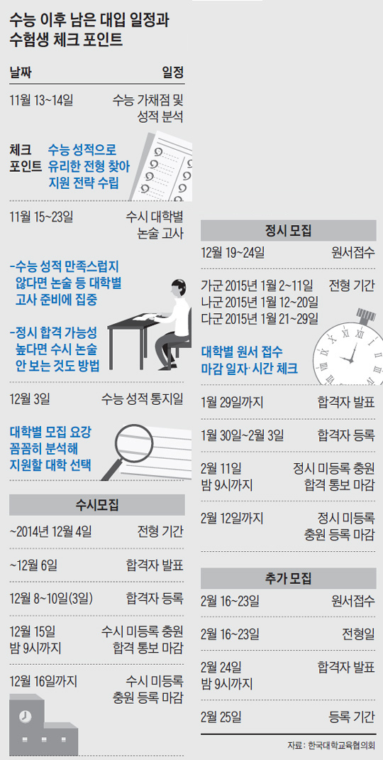 인문계열은 국어와 영어, 자연계열은 수학과 과학탐구에 가중치를 적용하는 대학이 많다. 이영덕 대성학력개발연구소장은 "상위권 대학 중에는 인문계에서도 수학 반영 비율이 높은 경우가 많기 때문에 수학의 영향이 크다"면서 "자신의 성적에 유리한 전형을 골라 지원하는 전략이 필요하다"고 말했다.