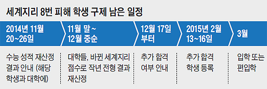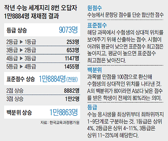 세계지리 성적을 재산정한 결과 총 9073명 학생의 등급(전체 학생을 1~9단계로 구분)이 한 계단씩 올라갔다. 2등급(4~11%)에서 1등급(상위 4%)이 된 학생은 253명, 3등급(11~23%)에서 2등급이 된 학생은 653명, 4등급(23~40%)에서 3등급이 된 학생은 1147명, 5등급(40~ 60%)에서 4등급이 된 학생은 1455명 등이다.
