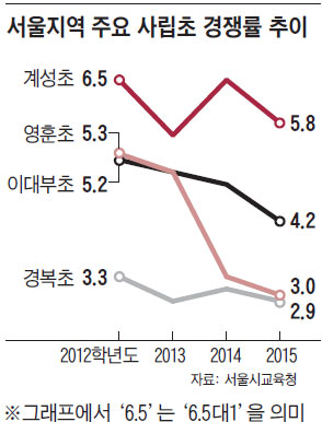 사립초등학교는 10여년 전 영어와 예체능 특화 교육으로 초등교육에 돌풍을 일으켰다. 2009학년도에 7.6대1에 이르렀던 영훈초의 경쟁률은 올해 3대1로 떨어졌다. 2012학년도와 비교하면 올해 계성초(6.5대1→5.8대1), 이대부초(5.2대1→4.2대1), 경복초(3.3대1→2.9대1) 등의 경쟁률도 하락세를 보였다.