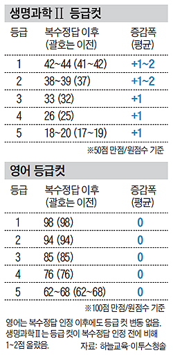 반면 이과생들이 응시한 생명과학Ⅱ는 상황이 다르다. 당초 평가원이 정답이라고 발표한 ④번을 선택한 학생은 10~12%이고, 24일 복수 정답으로 인정한 ②번을 선택한 학생은 66%이다. 정답자가 78%에 이르게 된다. 이 문제는 복수 정답으로 구제되는 학생이 기존 정답자의 5~6배에 달하기 때문에 평균점수가 당초보다 크게 올라, 수험생 개개인의 표준점수와 등급에도 적잖은 영향을 주게 된다. 생명과학Ⅱ 복수 정답으로 등급이 올라가는 학생은 최대 4000여명, 등급이 내려가는 학생은 3000여명에 이를 것으로 예상된다.