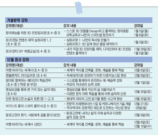 학생뿐 아니라 자녀에게 올바른 공부방법을 알려주는 '엄마랑 함께하는 메타인지 학습전략', 동양고전에 나타난 삶의 지혜를 알려주는 '동양고전의 향기, 사람에게 길을 묻다' 등 학부모가 들을 수 있는 강연도 풍성하다. '어거스트 홍의 스피치 클리닉' '3D 프린터 DIY체험교실' '창의재능을 위한 3D 프린팅 과정' '3D프린팅 콘텐츠 제작 심화과정' '4주간 40권 읽고 글쓰기 독서캠프(통학형)' 등 겨울방학 특별 강좌도 미리 신청할 수 있다.