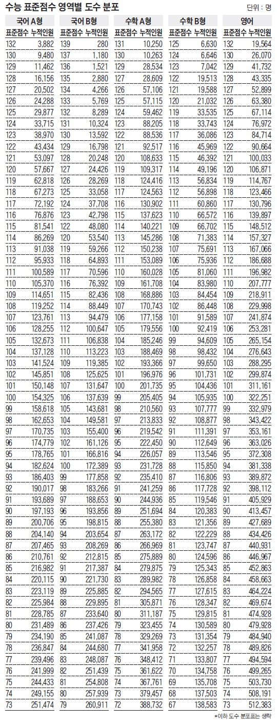 대학과 지원 전형에 따라 표준점수·백분위·등급 등 세 가지 성적 표기 중 어떤 점수를 반영하는지가 다르며, 영역별 반영 비율도 다르다. 예컨대 이화여대 수능 위주 전형 인문계열 학과는 수능(90%)과 학생부(10%)를 반영한다. 이때 수능은 표준점수를 반영하면서 영역별 반영 비율은 국어B 25%, 영어 35%, 수학A 20%, 사탐·과탐 중 1개 20%다. 수능 표준점수 총점이 같은 학생이라도, 대학·학과별 전형 방법에 따라 '환산 점수'는 달라지는 것이다. 유웨이중앙교육 이만기 평가이사는 "환산 점수를 계산해 내게 가장 유리한 대학·전형을 찾아야 한다"고 말했다.