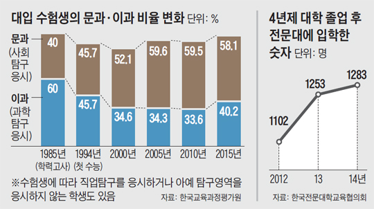 매년 2년제·4년제 대학 졸업자가 50만명 넘게 쏟아져 나오지만 이 같은 인력 공급과 수요의 심각한 불일치 때문에 숱한 청년들이 힘들게 입학한 대학에서 미래를 찾지 못하고 시간과 돈을 낭비하고 있다. 임규홍(27)씨는 2007년 수도권 A사립대 사회계열 학과에 입학해 2학년까지 다니다가 자퇴한 뒤 지난해 전문대인 대림대 자동차과에 입학했다. A대를 다닐 때 임씨는 졸업하고 뭘 할지 막막했다. 선배들은 취업에 필요한 스펙을 대학이 아닌 학원에서 쌓았다. 어영부영 2년을 다니고 휴학했을 때 '기술이 있어야 먹고살 수 있겠다'는 생각이 들어 다니던 대학을 자퇴하고 결국 전문대로 다시 들어갔다. 임씨의 대림대 자동차학과 후배인 이상욱(23)씨도 지방의 4년제 대학 광고홍보학과를 1년 다니다 자퇴하고 전문대로 재입학했다.