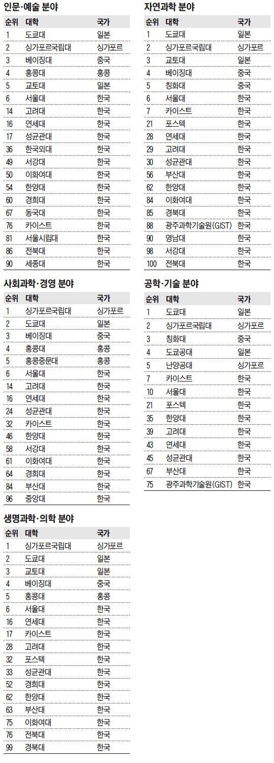 순위가 많이 오른 대학은 부산대(56위)와 한양대(62위)로 지난해보다 각각 25계단과 34계단 상승했다. 이공계 특성화 대학인 카이스트(7위)와 포스텍(21위)도 지난해보다 소폭 순위가 올랐다.