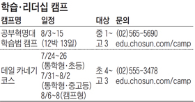 아무리 공부해도 오르지 않는 성적이 고민이라면 ‘공부혁명대 학습법 캠프’에서 그 해답을 찾을 수 있다. 송재열 공부혁명대 대장과 함께 학습계획을 세우고, 자기에게 맞는 수학, 국어, 영어 등 핵심 과목 공부법을 배우는 캠프다. 참가 학생은 12박 13일 캠프 기간에 담임 학습컨설턴트와 개별 상담을 통해 공부 전략과 학습 태도 등을 배우게 된다. 서울대·연세대·고려대 등 명문대 재학 중인 학습 멘토에게 주요 과목 공부 노하우도 전수받고, 매일 1대1 학습 지도를 받는다. 매일 △수학 개념 정리와 및 유형 문제 풀이 △수준별 영어 핵심 어휘 180개 익히기 △국어·탐구 공부법 교육 등이 진행된다.
