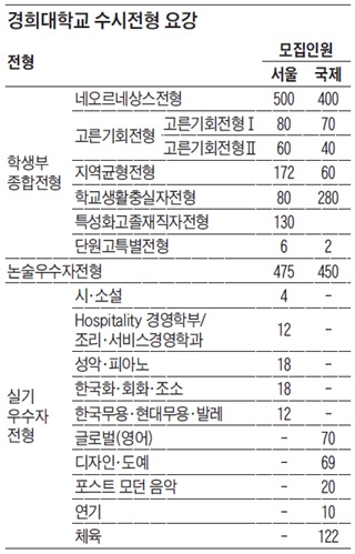 경희대는 대표적인 학생부종합전형인 네오르네상스전형에서 900명을 선발한다. 1단계는 서류종합평가다. ▲전형적합성 ▲전공적합성 ▲학업발전성 ▲인화관계성 ▲자기주도성 ▲경험다양성 등 6가지 평가 기준에 따라 항목별 점수를 매긴다. 이를 통해 모집 인원의 3배수를 뽑은 뒤 2단계에서 ▲1단계 성적(70%) ▲인성면접(30%) 점수를 합산해 최종 합격자를 선발한다. 지역균형전형 및 학교생활충실자전형은 ▲학생부 교과성적(70%) ▲서류종합평가(30%)를 일괄 합산해 최종 합격자를 선발한다. 지역균형전형은 대학 내 학생 구성의 다양성을 실현하기 위한 전형이다. 수도권을 제외한 고등학교장이 추천하는 학생 중 총 232명을 뽑는다.