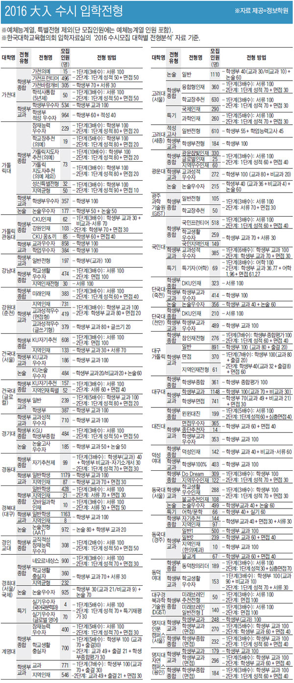 학생부종합전형 선발인원은 논술전형 선발인원의 축소와 함께 매년 증가하는 추세다. 수시 모집인원을 기준으로 2014학년도 12.4%, 2015학년도 15.6%, 2016학년도 18.5%로 꾸준히 늘고 있다. 올해 서울대를 포함한 주요 대학의 학생부종합전형 선발인원은 1만3000명 이상으로, 학생부교과전형보다 3배 이상을 선발하는 대학도 있다.