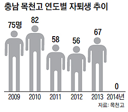 원래 목천고 학교 분위기는 '면학' '모범'과는 거리가 멀었다. 학생들은 툭하면 결석하기 일쑤였다. 천안 도심 학교에서 밀려난 거칠고 성적 나쁜 학생이 적지 않게 섞여 학습 분위기도 좋은 편은 아니었다. '연간 60일 이상 결석이면 퇴학'이란 규정에 따라 2009~2013년 자퇴자가 338명이나 나왔다. 2013년에도 전교생 600명 중 67명이 학교를 관뒀다. 이랬던 학교에서 그동안 무슨 일이 일어난 것일까.