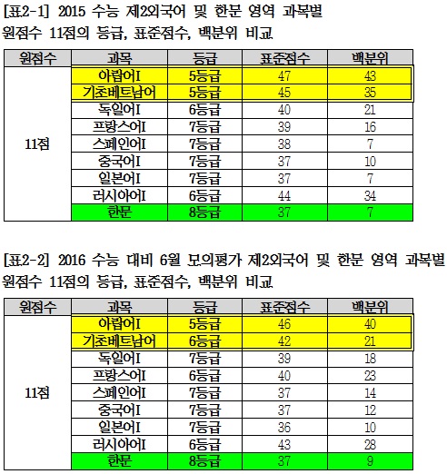 반면에, 지난해 수능에서 다른 과목의 경우에 원점수 득점 11점을 기준으로 받은 등급을 보면, 한문은 거의 꼴찌 수준인 8등급, 일본어 7등급, 중국어 7등급 등으로 아랍어와 비교할 때 최대 3등급의 차이가 났다.