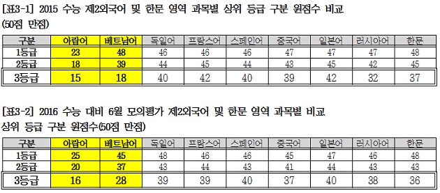 올해 실시된 6월 모의평가 결과에서도 원점수 득점 11점을 기준으로 아랍어는 5등급, 기초베트남어 6등급을 받은 반면에, 한문은 거의 꼴찌 수준인 8등급, 독일어 7등급, 스페인어 7등급, 일본어 7등급, 중국어 7등급 등으로 아랍어와 비교할 때 최대 3등급의 차이가 났다.