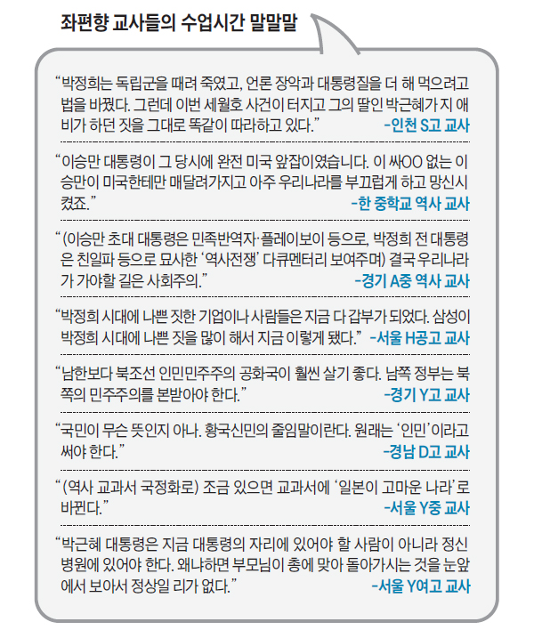 이승만·박정희 전 대통령을 아예 육두문자로 지칭하는 교사도 많았다. 수도권 B고교 교사는 "이승만 대통령은 개××, 박정희 대통령은 다카키 마사오(박 전 대통령의 일본식 이름)"라고 했다.