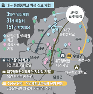 3년째 자유학기제를 운영 중인 동변중의 ‘일터 체험’ 프로그램은 학생들이 자기가 원하는 체험처를 골라 3일간 체험하는 형태다. 올해는 꿈꾸는 시어터, 한국철도공사, 현대백화점, 서변유치원 등 31개 체험처를 마련, 151명 학생을 대상으로 진행하고 있다. 김주미 전문상담교사는 “학교에서 상담해 보면 자유학기제 실시 후 아이들이 진로에 대해 깊이 고민하는 등 큰 변화를 느낀다”고 설명했다. 처음에는 학력 저하 등을 걱정하던 학부모 반응도 달라졌다. 김명희 교무부장은 “자유학기는 ‘노는 학기’가 아니라 책상에 앉아서만 하던 공부를 세상에 나와서 하는 것”이라며 “자유학기가 끝날 때마다 학생·학부모 만족도 조사를 해보면 처음 걱정과 달리 만족도가 매우 높게 나타난다”고 설명했다. 동변중은 일터 체험뿐 아니라 ‘미니 창업 교육’ ‘직장인 초청 특강’ 등 다양한 진로 탐색 교육을 하고 있다. 정유진양은 “창업 교육을 받은 후 친구들과 치즈스틱·솜사탕·팝콘 등을 직접 팔기도 했다”며 “큰 냉장고 박스를 자판기처럼 꾸미고 그 안에 사람이 들어가 돈을 받고 파는 아이디어를 냈더니, 판매 성과도 아주 좋았다”고 전했다. 동변중은 자유학기 성과가 2~3학년에도 이어지도록 ‘대학·학과 탐방’ 등 후속 프로그램까지 구성했다.