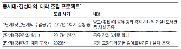 두 대학은 대학 조립의 핵심축을 공유 강좌에서 찾았다. 상대적으로 이공계에 강한 동서대가 경성대에 과학 분야 교양강좌를 열고, 인문·사회 분야가 나은 경성대가 동서대에 관련 수업을 개설해 교육의 질을 함께 높이자는 것이다. 올해 1학기에 한 과목씩 개설한 공유 강좌는 올해 2학기에 6개로 확대된다. 오는 2020년까지는 아예 교양대학(리버럴아트칼리지)을 공동 설립·운영하기로 했다. 박성미 동서대 교학부장은 "리버럴아트칼리지에는 경쟁력 있는 두 학교의 교양강좌 20개 정도를 개설할 예정"이라고 말했다.