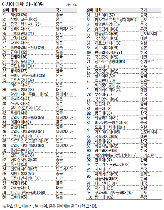 서울대는 전체 교원(3930명)의 약 11%가 외국인이다. 반면 아시아 최선두권인 난양공대, 홍콩과기대, 홍콩대 등은 교수진의 70%가 외국인으로 서울대보다 훨씬 비율이 높다. 서울대 관계자는 "우수한 외국인 교수를 홍콩·싱가포르가 아닌 서울대로 데려오려면 교수에게 더 좋은 점이 있다는 점을 이해시켜야 하는데 방법이 없다"면서 "연봉은 낮고, 연구 환경은 열악하고, 국제학교 부족 등 자녀 교육 환경까지 안 좋은데 누가 오려고 하겠느냐"고 말했다.