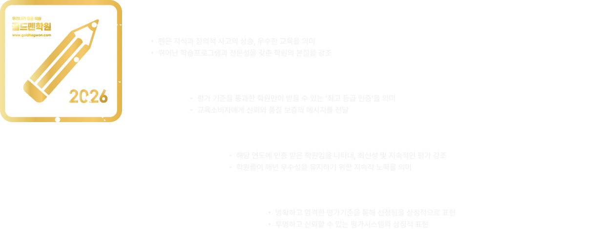 골드펜학원은 우리 아이들이 우수한 학원에서 질 높은 교육을 받을 수 있도록 전국 학원들을 객관적으로 평가하는 인증제도입니다.