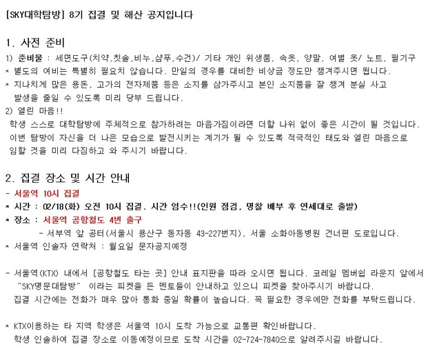 [SKY명문대탐방] 8기 준비물 및 집결, 해산 관련 공지