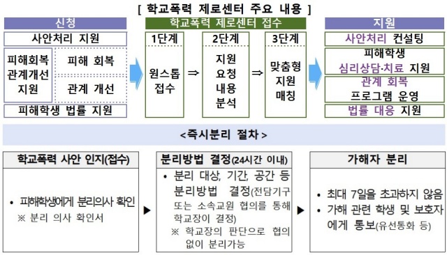 아울러 총 8개의 시도교육청은 오는 9월부터 12월까지 ‘학교폭력 제로센터’를 시범 운영한다. 단위학교 및 학교폭력 피해학생은 한 번의 신청을 통해 원스톱으로 학교폭력 사안 처리, 피해학생 상담·치료, 피·가해학생 관계 개선, 피해학생 법률서비스 등 다양한 맞춤형 지원을 제공받을 수 있다.