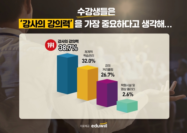 14일 에듀윌에 따르면, 20~40대 취준생 및 공무원∙자격증 수험생 150명을 대상으로 설문조사를 실시한 결과, 전체 응답자의 38.7%가 강의를 선택할 때 ‘강사의 강의력’이 가장 중요하다고 응답했다.