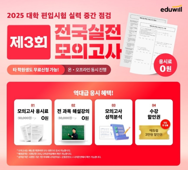 에듀윌이 2025학년도 대학 편입시험을 준비하고 있는 수험생들의 중간 실력 점검을 위해 오는 30일 ‘제 3회 전국 실전 모의고사’를 진행한다.