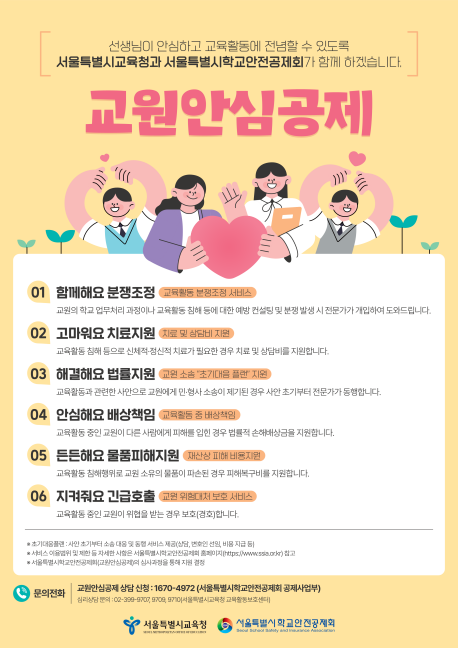 서울시교육청은 교육활동보호 매뉴얼과 함께 2024년 강화된 「교원안심공제」서비스에 대한 포스터 및 동영상도 함께 배부했다. 교원안심공제는 교육활동 침해 사안 발생 시 상담‧치료‧분쟁‧조정‧배상 관련 서비스를 제공한다.