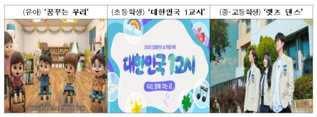 교육부는 학생들의 장애에 대한 인식개선을 위해 2005년부터 매년 특별기획 방송 프로그램을 포함한 교육 콘텐츠를 제작·보급해 왔다. 올해도 각급 학교에서 장애 이해 교육에 활용할 수 있도록 동영상 콘텐츠 배포(유아) 및 방송 프로그램(초·중·고)을 송출할 계획이다. 해당 교육자료는 국립특수교육원 누리집 등에 탑재되며 누구나 시청하거나 내려받아 활용할 수 있다.