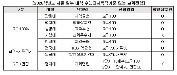 내신성적을 중심으로 선발하는 학생부교과전형에서 수능최저학력기준을 적용하지 않는 서울권 대학들이 있다. 건국대, 광운대, 동국대, 명지대, 상명대, 서경대, 한성대 등이다. 이 중 상명대는 지난해까지 반영하던 수능최저학력기준을 올해 폐지했다.